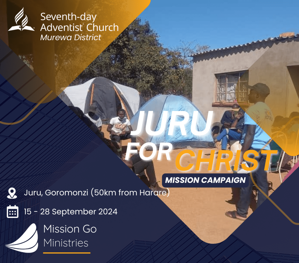 Mission Go will be partnering with Murehwa District Seventh-day Adventist Church for a series of evangelistic meetings in Juru, Goromonzi from the 15th to the 28th of September 2024. Your prayers and support will be needed as we take the Three Angels’ Messages to the people of Juru.